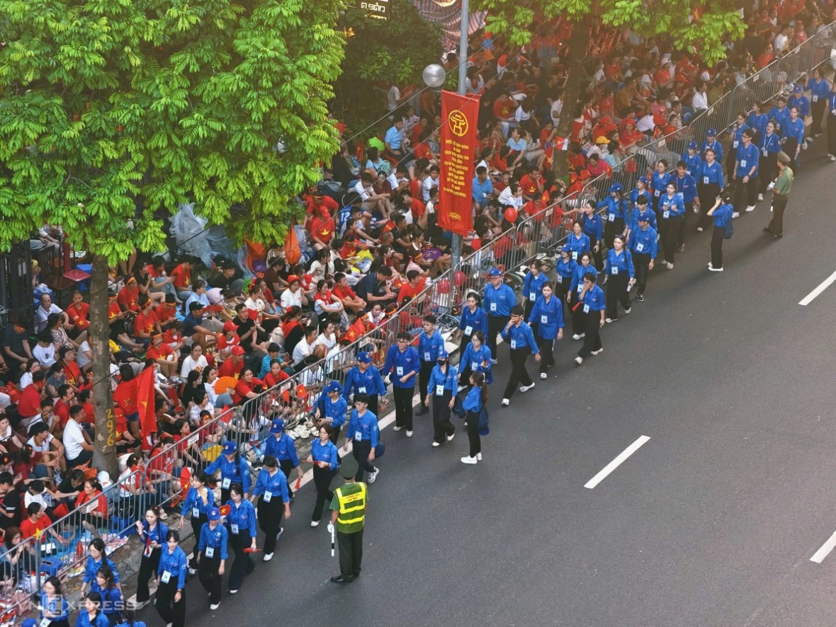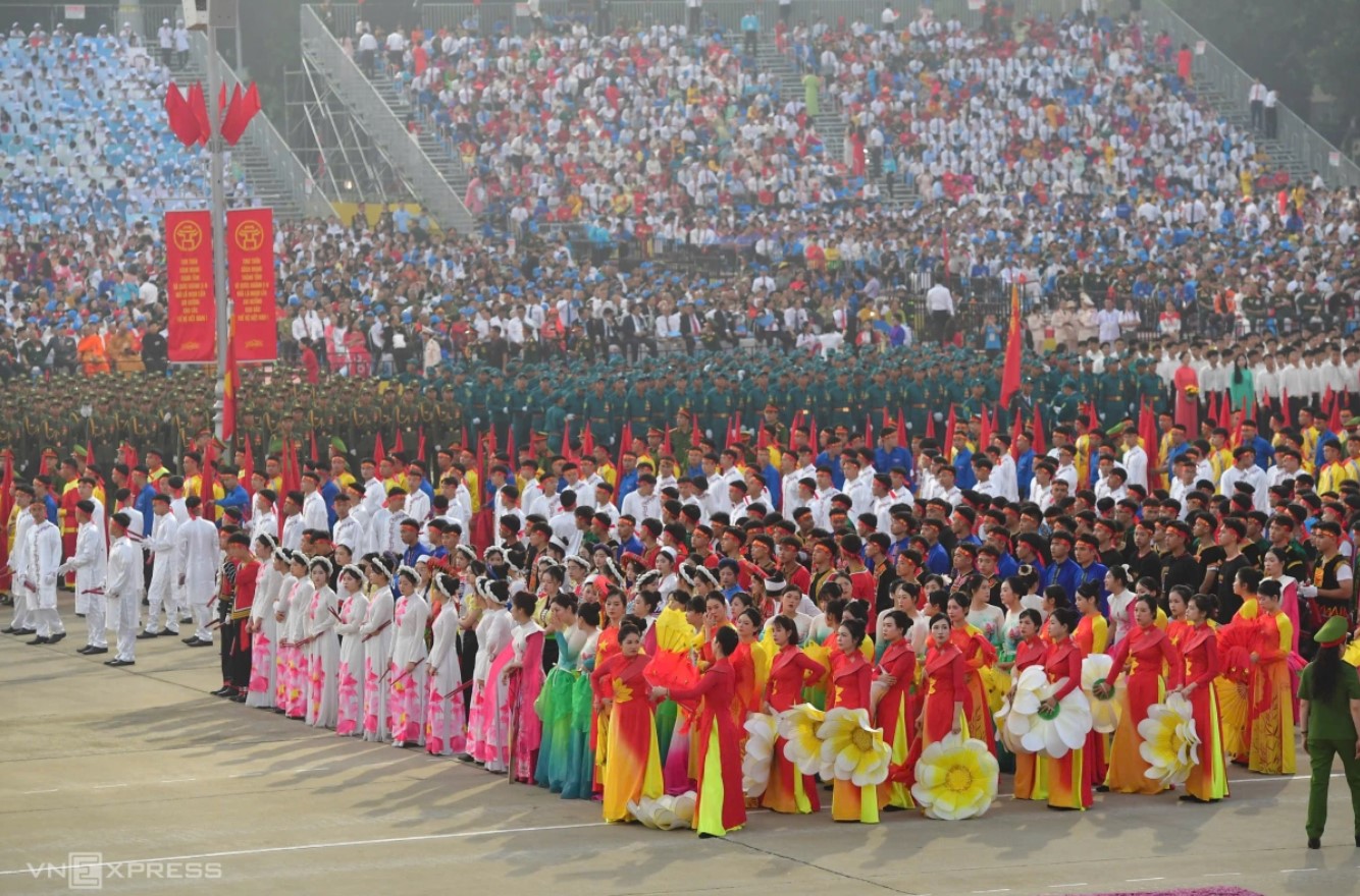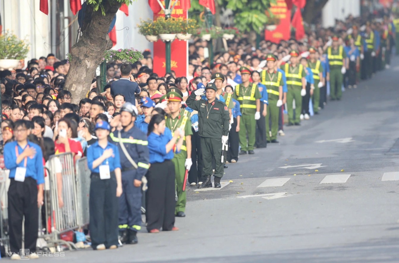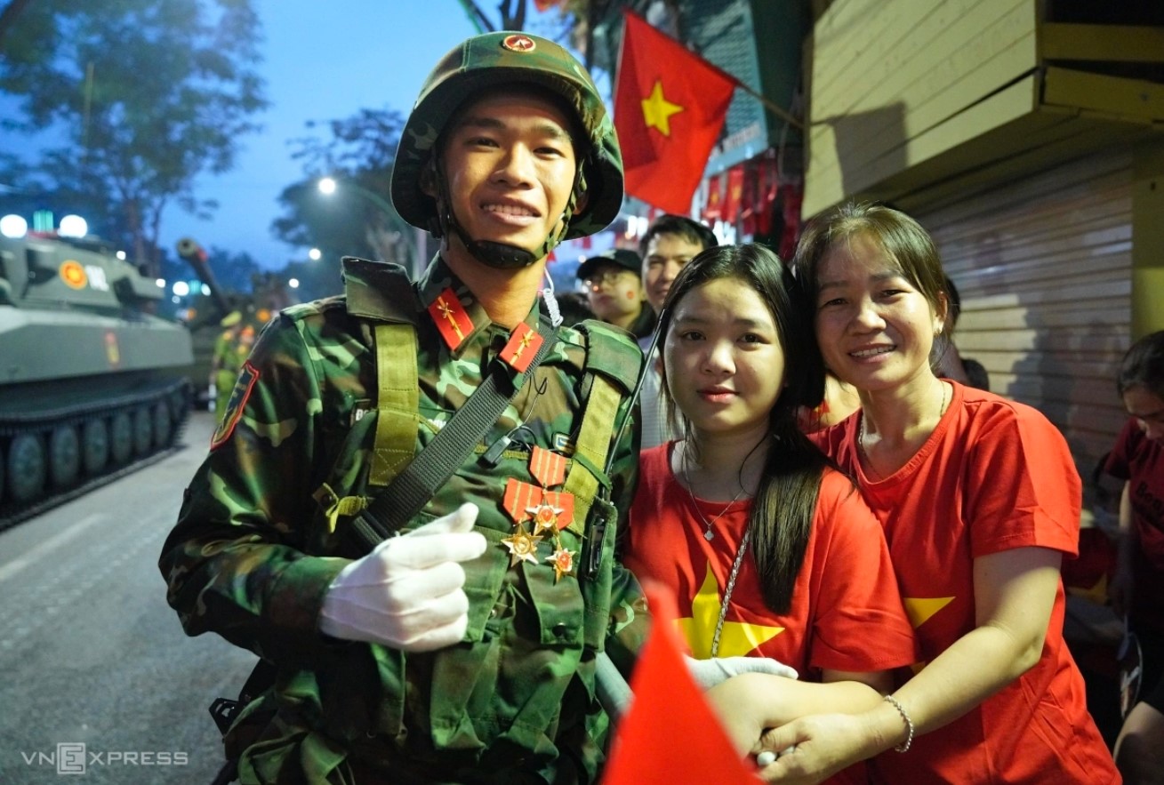 Trên các tuyến Trần Phú, Điện Biên Phủ, Kim Mã, Nguyễn Thái Học, từng hàng dài người đứng sát barie, nhiều gia đình cho trẻ nhỏ ngồi trên vai để nhìn rõ hơn. Hàng nghìn cựu binh được xếp chỗ ngồi ưu tiên, háo hức chờ đoàn quân tiến qua. Trong khán đài, các đoàn đại biểu trong và ngoài nước ngồi kín hơn 30.000 ghế.
