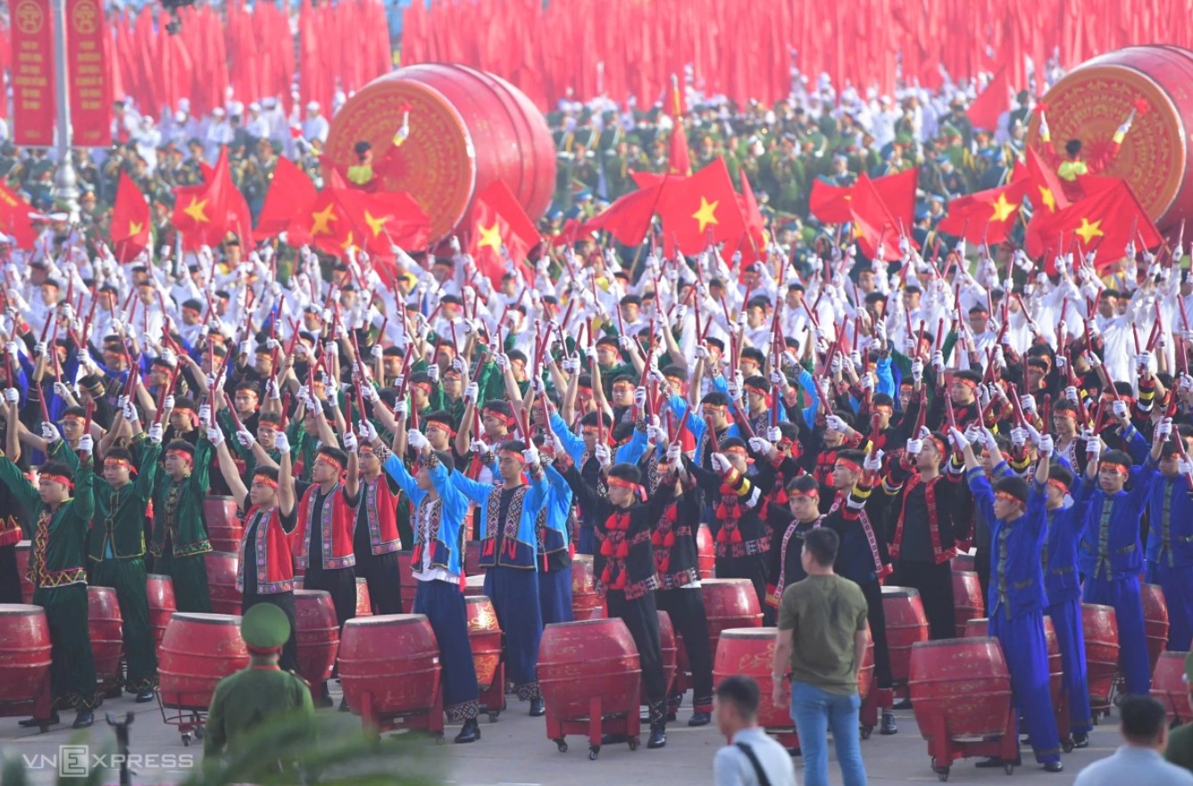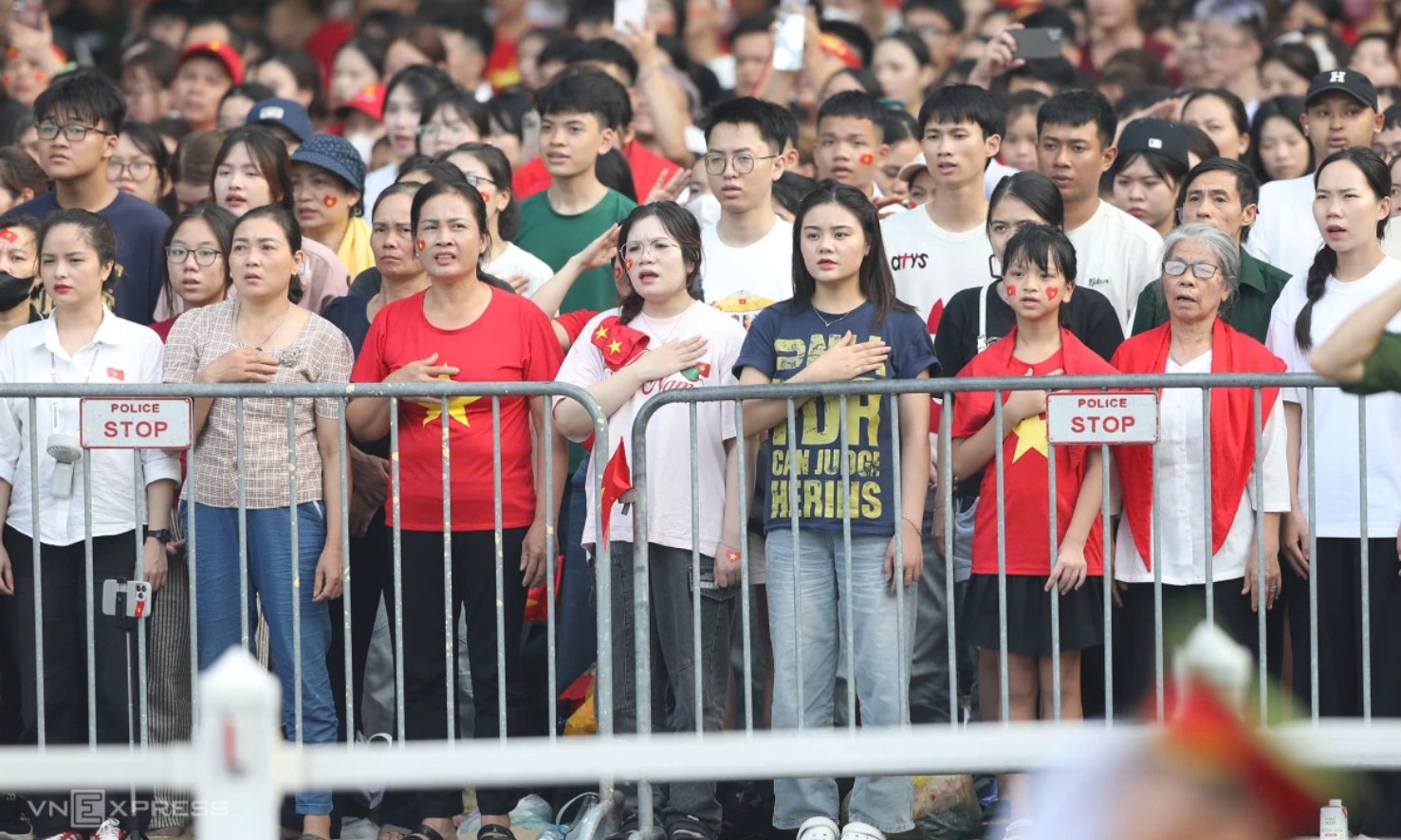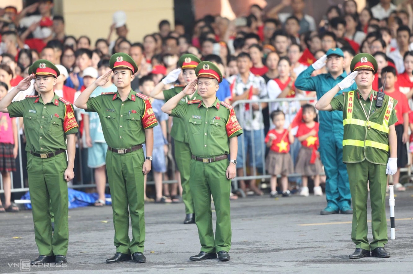 Trên các tuyến Trần Phú, Điện Biên Phủ, Kim Mã, Nguyễn Thái Học, từng hàng dài người đứng sát barie, nhiều gia đình cho trẻ nhỏ ngồi trên vai để nhìn rõ hơn. Hàng nghìn cựu binh được xếp chỗ ngồi ưu tiên, háo hức chờ đoàn quân tiến qua. Trong khán đài, các đoàn đại biểu trong và ngoài nước ngồi kín hơn 30.000 ghế.