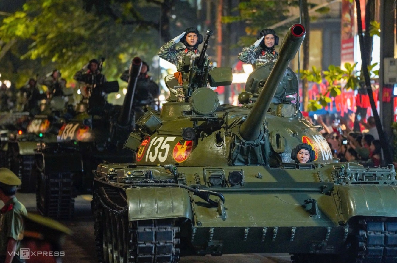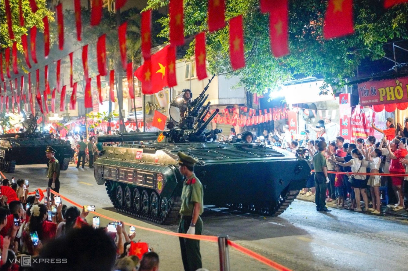 Đoàn xe tăng tham gia duyệt binh đi ra đường Cửa Bắc để về nơi tập kết. Hàng nghìn người dân thức trắng đêm trên tuyến đường này đã reo hò vang dậy cả tuyến phố.